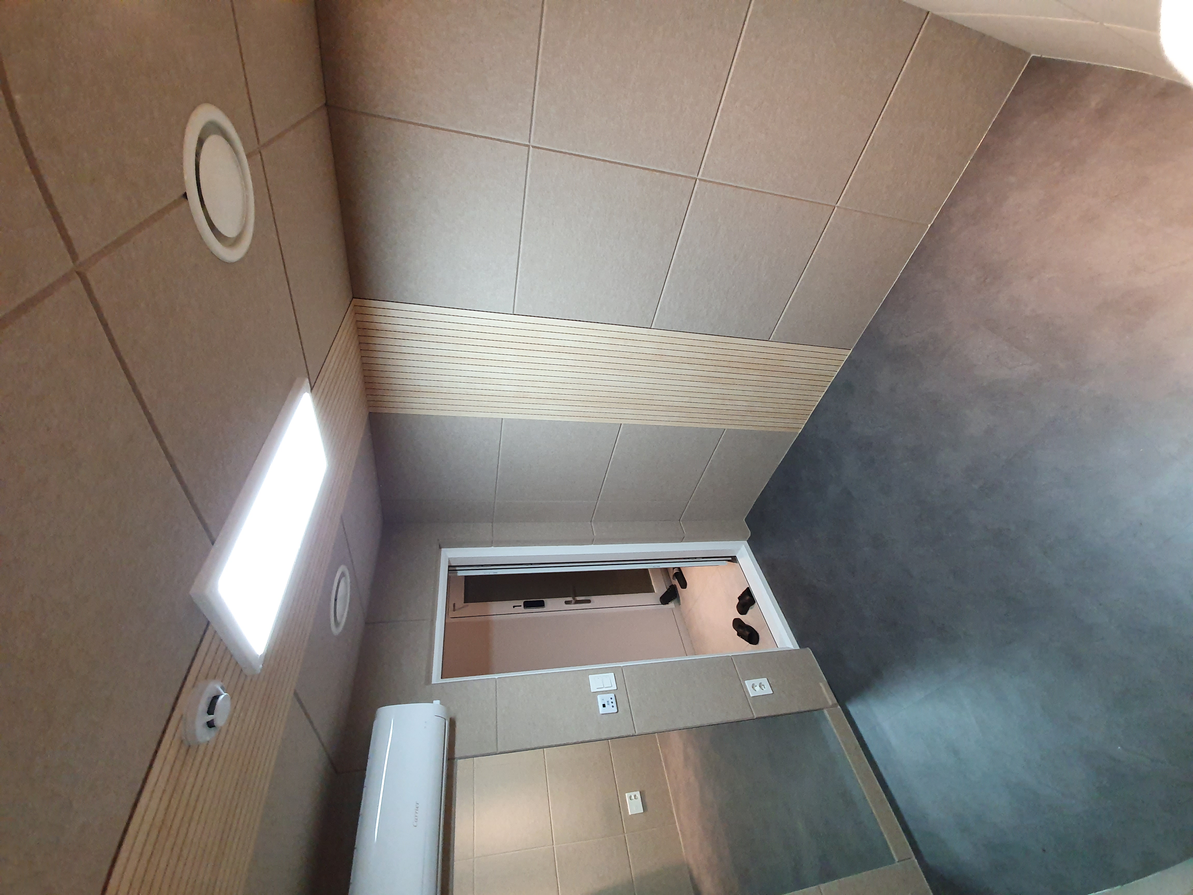흡/배기 방음덕트에서도 각방의 소리가 혼합되지 않도록 중간에 중앙 분배 방식으로 연결했으며 소리가 새기 쉬운 문도 이중문으로 설계/설치했습니다!